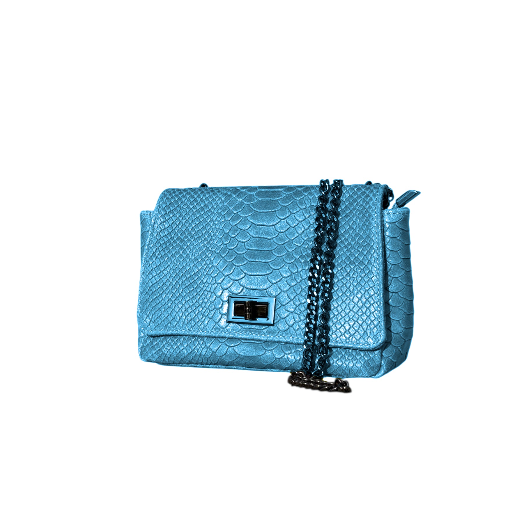 Pelle bovina morbida effetto coccodrillo, chiusura a vite in metallo e tracolla a catena: